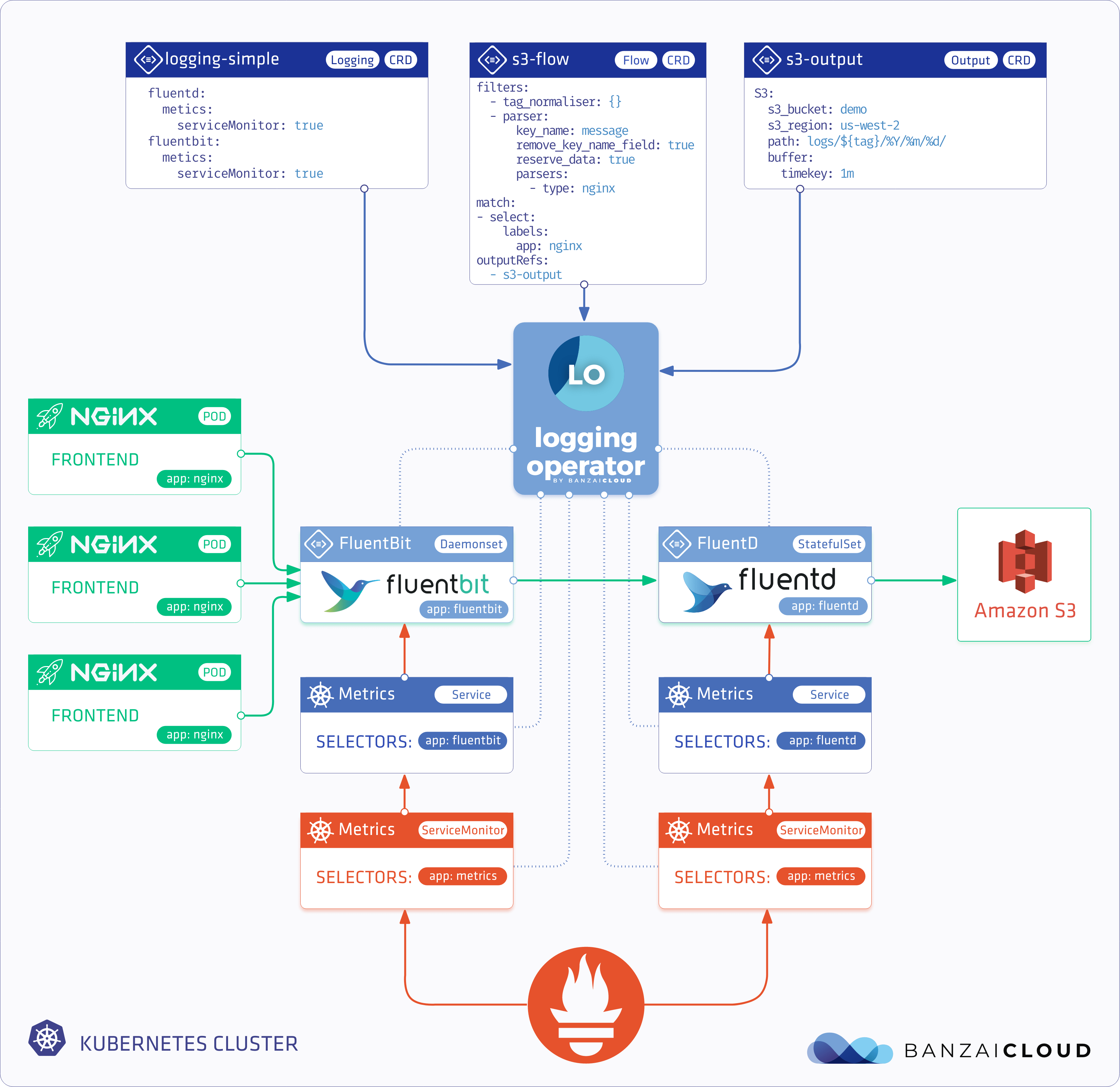 You can configure the Logging operator to expose metrics endpoints for Fluentd, Fluent Bit, and syslog-ng using ServiceMonitor resources. That way, a Prometheus operator running in the same cluster can automatically fetch your logging metrics.